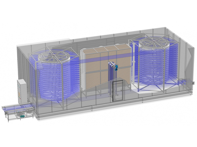 El congelador en espiral de baja tensión de dos cilindros que fabrica Square Technology se utiliza para el congelamiento rápido individual de alimentos granulados o en pequeñas piezas. Sin embargo, este sistema de congelación a gran escala también es apto para la congelación rápida individual de alimentos congelados grandes, como comidas preparadas, pollos enteros, pescado entero, y otros. La entrada y salida del congelador en espiral de dos cilindros desde la posición baja es conveniente para la operación y se puede adaptar a las líneas de producción del cliente.