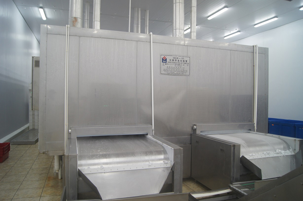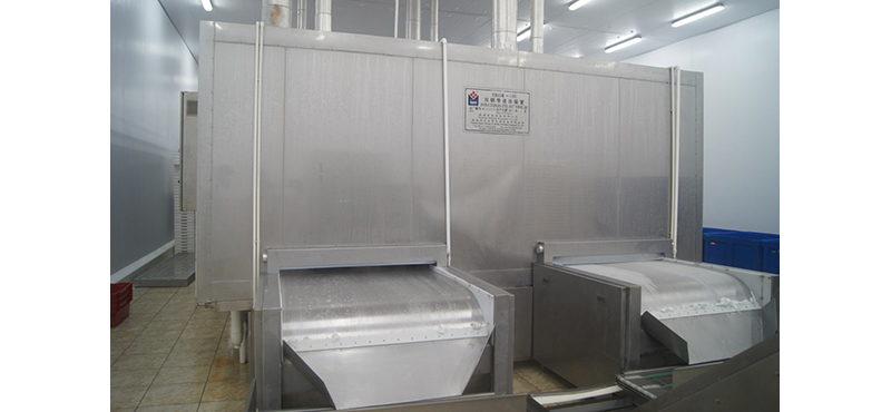 El túnel de congelación de banda de acero se utiliza generalmente para congelar productos alimenticios planos, como filetes de pescado, y camarones pelados, calamares, y albóndigas, entre otros. El túnel de congelación cuenta con un evaporador higiénico de alto rendimiento, que utiliza el método más reciente de suministro de líquido, permitiendo un 20% más de eficiencia en el intercambio térmico que el método tradicional.