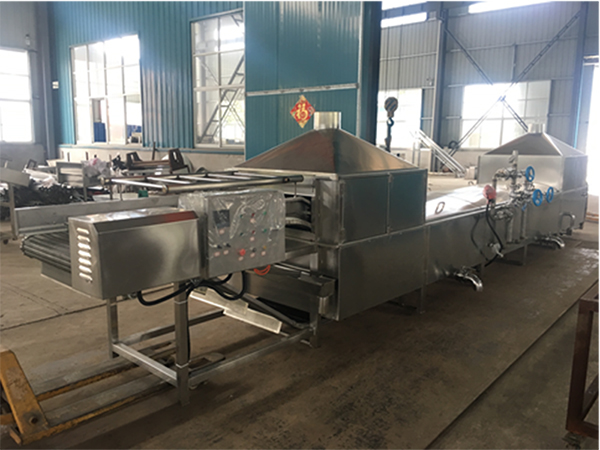 Los productos limpios ingresan al escaldador y se mueven en el agua hacia adelante, impulsados por las aspas en espiral. La temperatura del agua es de 98±2℃. Para cumplir con el tiempo y los requerimientos del blanqueo de los distintos tipos de vegetales, ajustamos la velocidad del espiral mediante el control del conversor.